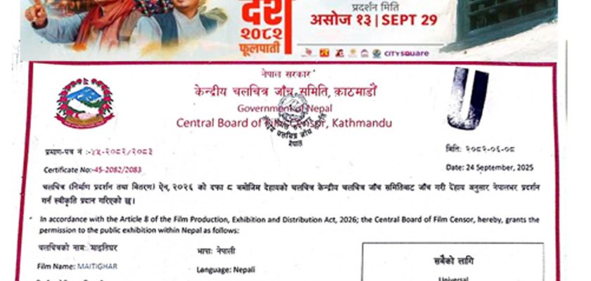 पोखरा । फिल्म ‘माइतीघर’लाई चलचित्र जाँच पास समितिले ‘यूनिभर्सल’ सर्टिफिकेट दिएको छ । यो फिल्मको बुधबार बेलुकी सेन्सर भएको हो ।